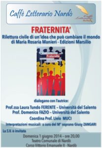p.s.  presso la segreteria del Caffè Letterario, sono già disponibili alcune copie del libro, della nostra socia Professoressa Maria Rosaria Manieri, che potranno essere acquistate dai soci ad un prezzo scontato, grazie ad una collaborazione con la Libreria Fiore di Nardò. Rino Vergari (presidente)